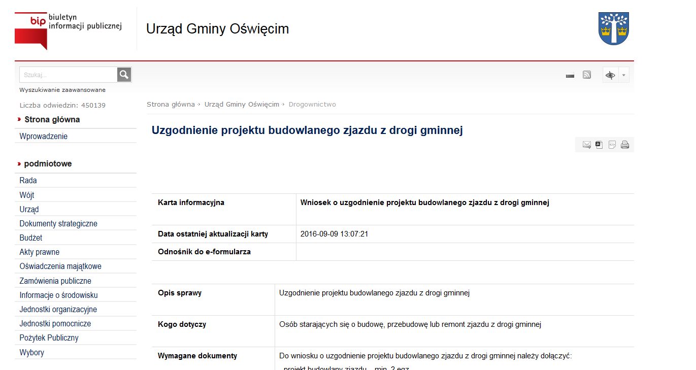 Na każdej stronie Gminy Oświęcim, jednostek podległych znajdujących się na portalu gminy Oświęcim, znajduje się link Jak załatwić sprawę urzędową? - umieszczony zawsze w tym samym miejscu, gdzie znajdziemy informację dot. sposobu załtawienia spraw urzędowych.