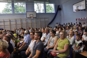 Część oficjalną kontynuowano już we wnętrzu szkoły – proboszcz porębskiej parafii poświęcił budynek, a następnie zgromadzeni goście zebrali się w nowej sali gimnastycznej, by wysłuchać podziękowań i przemówień z okazji otwarcia szkoły.