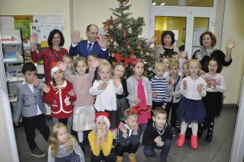Najwyższe gałązki drzewka, które stoi w holu, są poza zasięgiem dziecięcych rączek. Nawet niektórzy dorośli mają kłopot, żeby ich dosięgnąć, dlatego niezbędna była praca zespołowa. Udało się połączyć zmysł organizacyjny i tężyznę fizyczną. Tym sposobem najmłodsi pomogli wójtowi Mirosławowi Smolarkowi ubrać świąteczną choinkę w kolorowe i słodkie ozdoby.