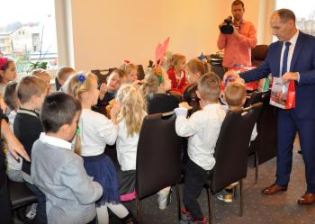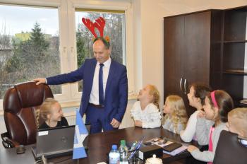 Chwilę później przedszkolacy opanowali najważniejszy gabinet w Urzędzie. Sprawdzili, jak się siedzi w fotelu wójta, ale ogromne – z ich perspektywy – biurko nieco ich onieśmieliło. Nie zapomnieli jednak, że przyszli załatwić najważniejsze sprawy. Złożyli szczególny dokument: zarazem wniosek i zarządzenie, żeby wszystkie dzieci były szczęśliwe. Sześcioletni Krystian potwierdził przedłożone pismo własnoręcznie narysowanym samochodem.