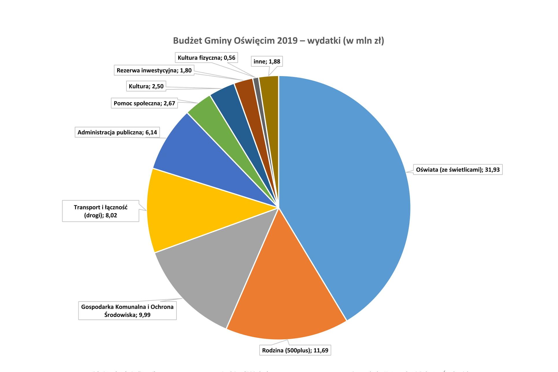 Modernizacja, remonty i budowa dróg oraz transport publiczny pochłoną w 2019 roku 8,02 mln zł. Administracja będzie kosztować 6,14 mln zł, w tym funkcjonowanie Urzędu Gminy Oświęcim – 4,23 mln, z czego 2,48 mln to wynagrodzenia pracowników. Pomoc społeczna będzie kosztować 2,67 mln zł. Na kulturę i ochronę dziedzictwa narodowego zapisano w budżecie 2,5 mln zł, a na kulturę fizyczną nieco ponad 0,5 mln.