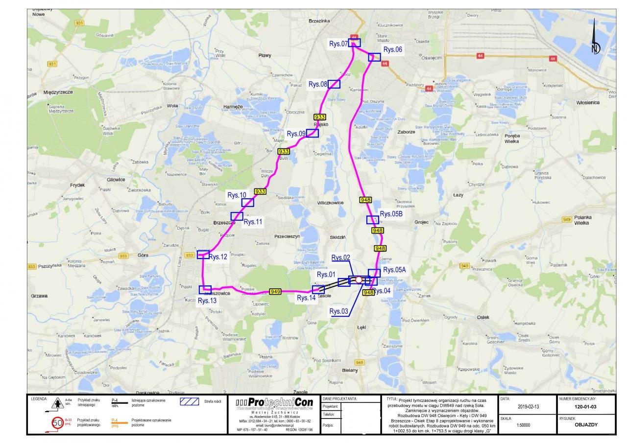 Poniżej: "Projekt tymczasowej organizacji ruchu na czas przebudowy mostu w ciągu DW 949 nad rzeką Soła. Zamknięcie z wyznaczeniem objazdów".