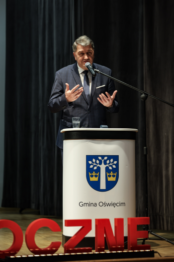Na scenie pojawił się wójt gminy Oświęcim Mirosław Smolarek, który w swoim podsumowaniu roku 2025, przypomniał najważniejsze inwestycje dotyczące infrastruktury, ochrony środowiska,