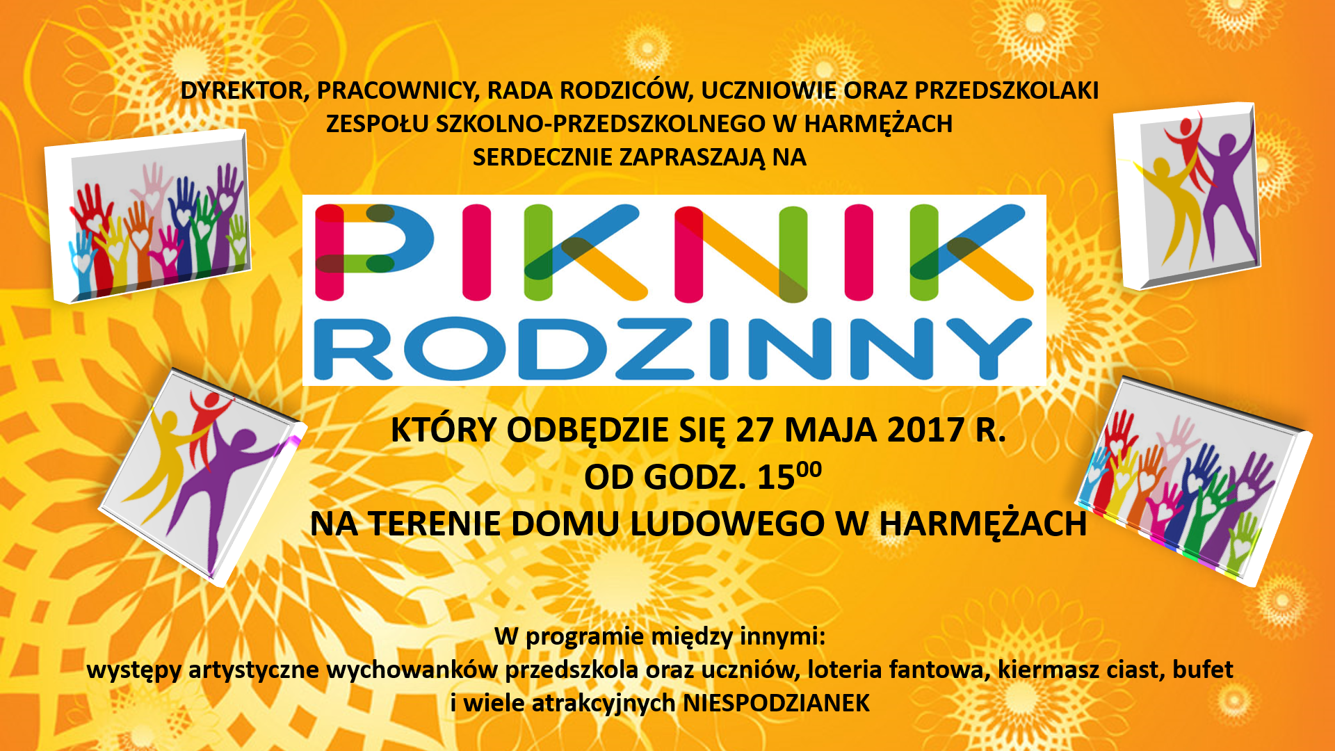 Dyrektor, nauczyciele i Rada Rodziców Zespołu Szkolno-Przedszkolnego w Harmężach zapraszają na Piknik Rodzinny organizowany przy OSP w dniu 27 maja (sobota) w godzinach 15:00 – 18:00 oraz na zabawę taneczną, która rozpocznie się o godz. 18:00.